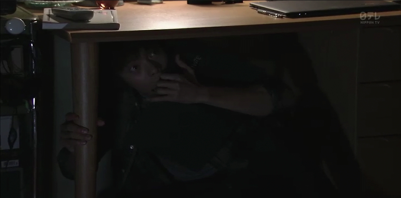 突然現れたデュークに驚き机の下に隠れる月。もっとデュークの前でも毅然としてたような気がするが……
